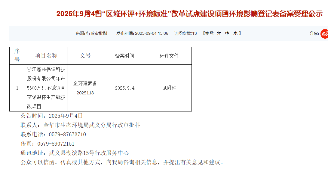 2025年9月4日,金華市生態環境局受理武義分局浙江嘉益保溫科技股份有限公司年產5600萬只不銹鋼真空保溫杯生產線技改項目環境影響評價報告表并對外進行公示。