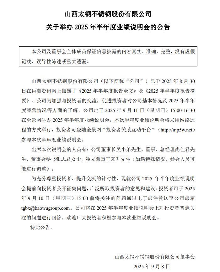 9月9日,山西太鋼不銹鋼股份有限公司發布關于舉辦 2025 年半年度業績說明會的公告。公司定于 2025 年 9 月 11 日(星期四)15:00-16:30 在全景網舉辦 2025 年半年度業績說明會,本次半年度業績說明會將采用網絡遠 程的方式舉行。