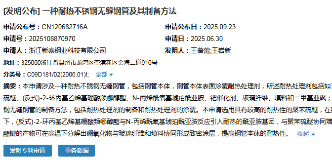 2025年9月23日,浙江新泰鋼業(yè)科技有限公司成功申請一項名為“一種耐熱不銹鋼無縫鋼管及其制備方法”專利,申請公布號為CN120682716A,申請日期為2025年6月30日。
