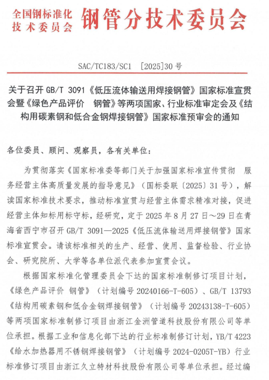 經研究,定于2025年8月27-29日在青海省西寧市召開《綠色產品評價鋼管》和YB/T4223《給水加熱器用不銹鋼焊接鋼管》等兩項國家、行業標準審定會及GB/T13793《結構用碳素鋼和低合金鋼焊接鋼管》國家標準預審會。