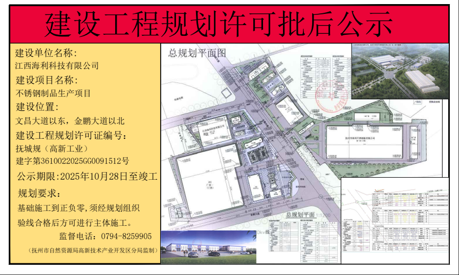 江西海利科技公司不銹鋼制品生產項目建設工程規(guī)劃獲得許可批后公示