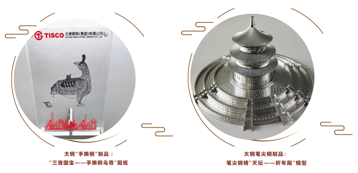 據(jù)了解,此展品分別是太鋼“手撕鋼”制品 ——“三晉國寶——手撕鋼鳥尊”剪紙,太鋼筆尖鋼制品——筆尖鋼鑄“天壇——祈年殿”模型。