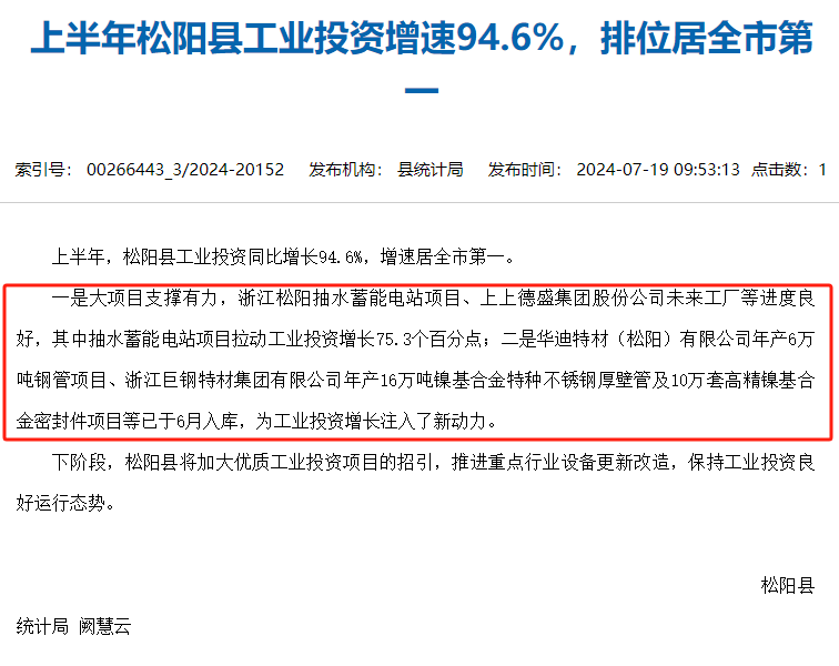 7月19日,據松陽縣統計局發文稱,“上半年,松陽縣工業投資同比增長94.6%,增速居全市第一?!?/p>